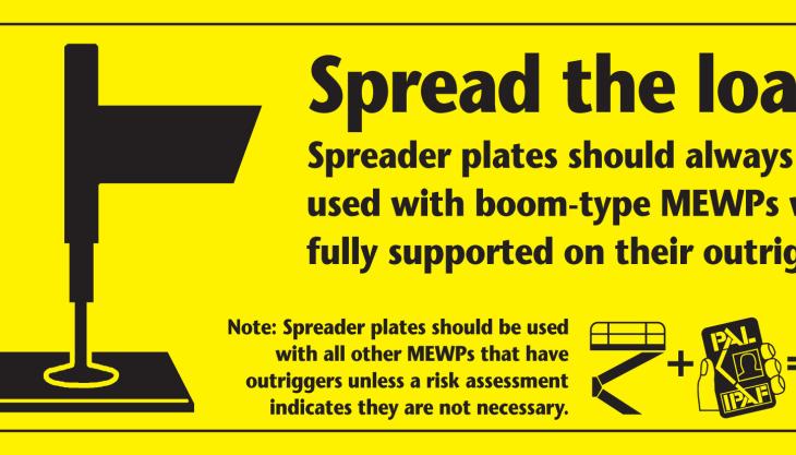 IPAF has launched a new safety campaign built around the following simple and straightforward message: ‘Spreader plates should always be used with boom-type mobile elevating work platforms (MEWPs) when fully supported on their outriggers. Spreader plates should be used with all other MEWPs that have outriggers unless a risk assessment indicates they are not necessary.’