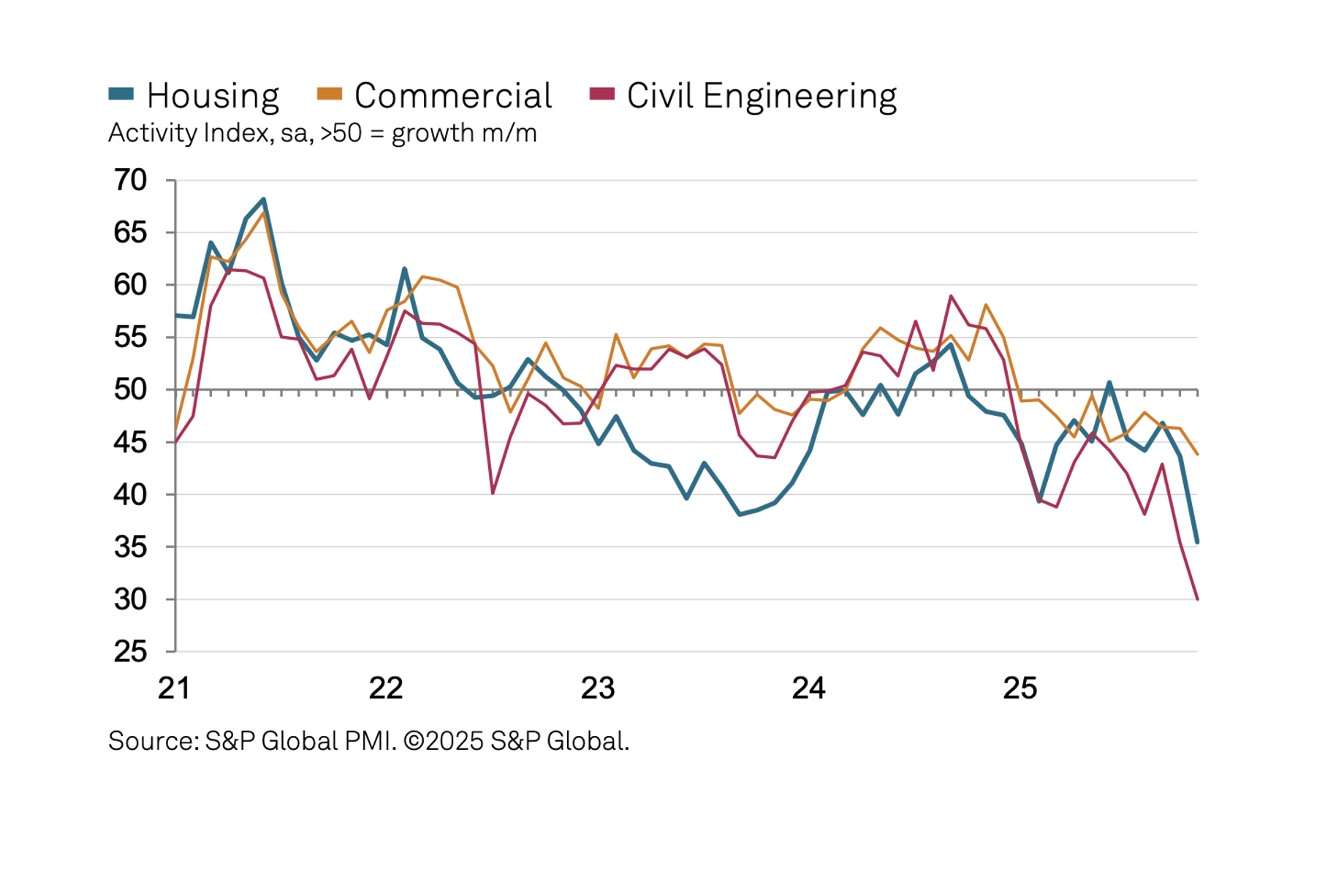 Sub-sector data showed that housing activity (index at 35.4), commercial construction (43.8) and civil engineering (30.0) all experienced the fastest downturns in activity for five-and-a- half years. Survey respondents commented on fragile market confidence, delays with the release of new projects and a general lack of incoming new work.