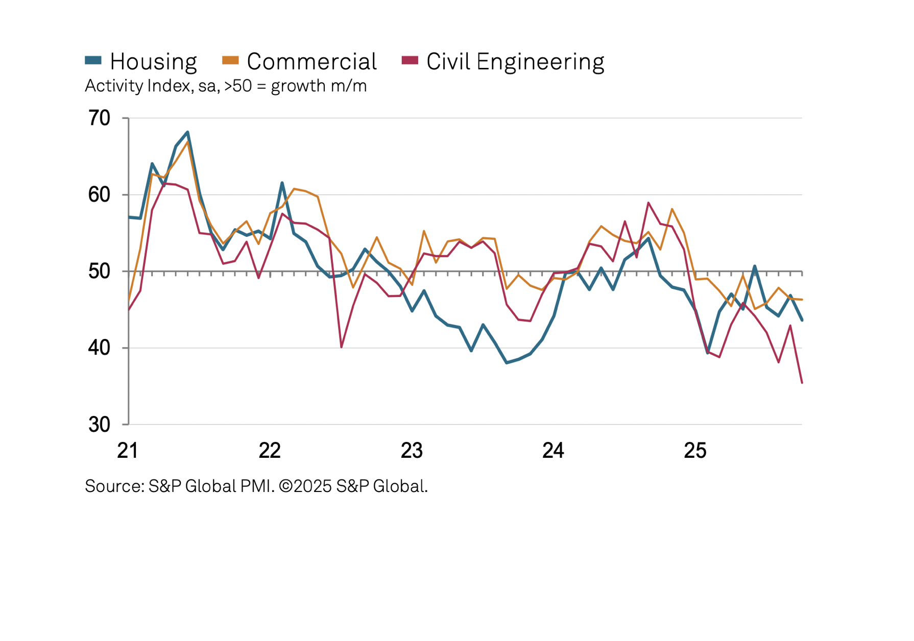 Civil engineering remained the weakest-performing segment in October (index at 35.4), with business activity falling sharply and at the fastest pace since May 2020. Survey respondents widely cited a lack of new work to replace completed projects. Residential work (index at 43.6) also decreased markedly, and the latest decline was the greatest for eight months. Commercial building activity, meanwhile, showed some resilience as the latest index reading (46.3) was little-changed since September.